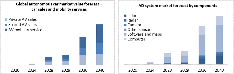 We provide a twenty-year market forecast, in both sales numbers and revenues, for both private-owned autonomous cars and shared cars for mobility services (or robotaxis). For the market value forecast, we break it down into the revenues from AV sales as well as revenues from AV mobility services. We built a twenty-year model because our forecast suggests that the transformation towards fully autonomous driving will take place over a long timescale. We also builds a twenty-year market value forecast for the key components of AV systems - lidars, radars, cameras, AI software, computers etc. According to our forecasts, by 2040 global autonomous car (SAE Level 3+) and robotaxi services will become a $2.5 trillion market. By 2030, the autonomous driving system (including lidars, radars, cameras, computers, software and maps) market will reach $57 billion; the market value will more than triple by 2040, reaching $173 billion.