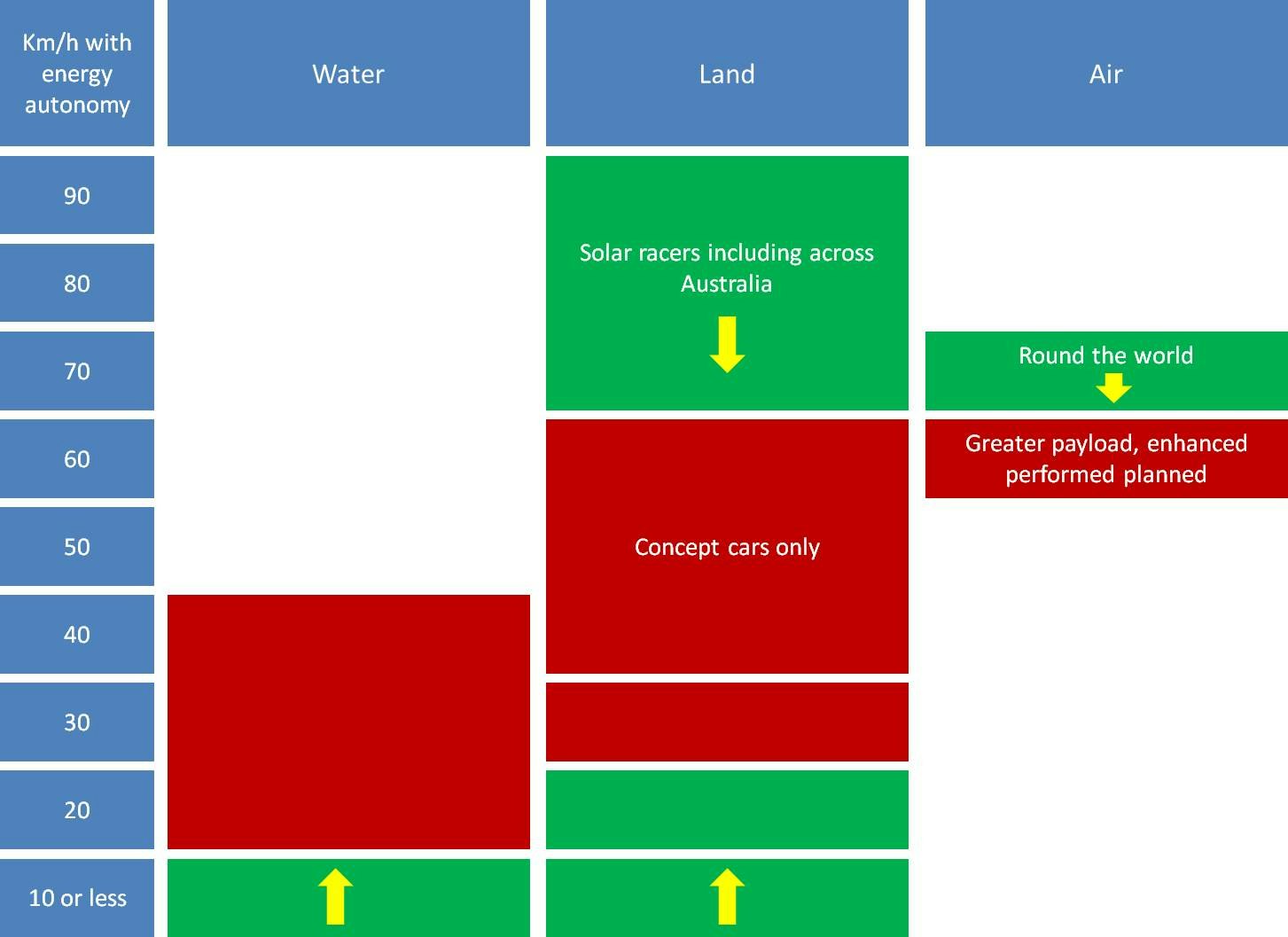 Land and water vehicles are pushing for higher speeds but the aircraft have got there and are now seeking other things, sometimes at slower speed. The other things include carrying more people and cargo and going further. The arrows show the trend in speed of next generation vs today's EIVs.