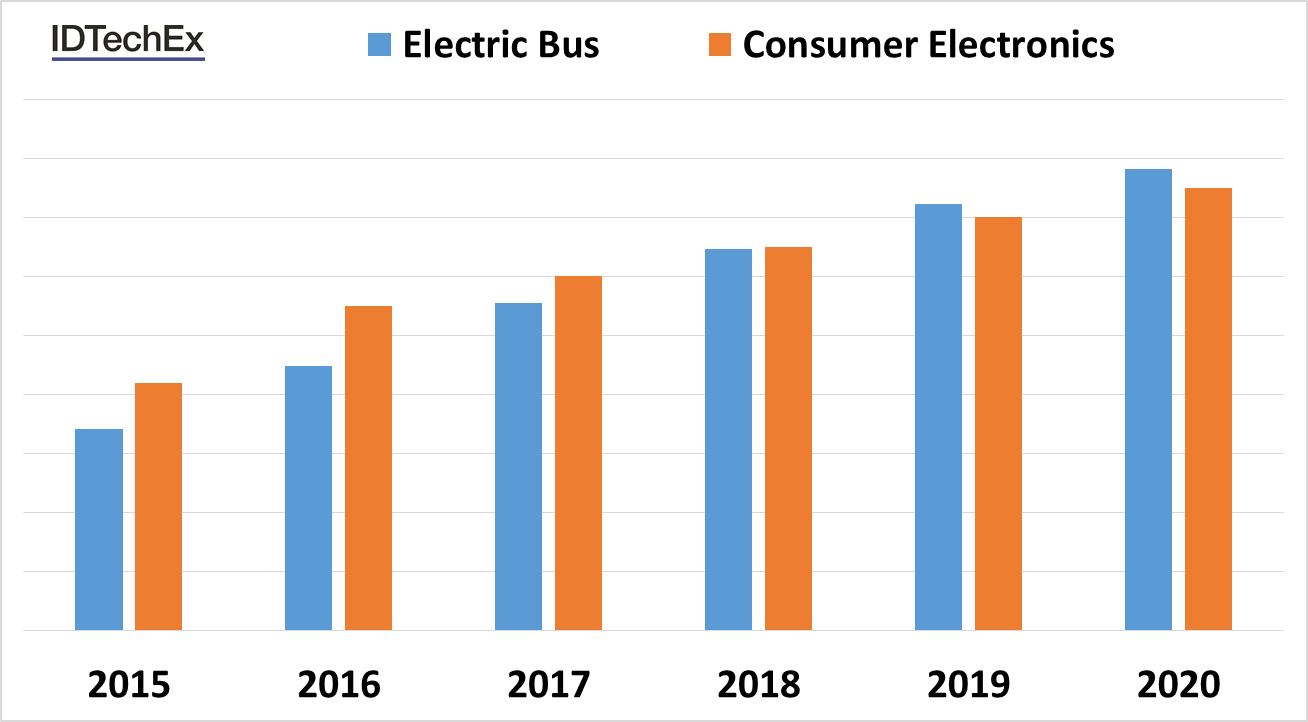 Figure 1. Comparing the market size for consumer electronic and electric bus batteries. Electric bus batteries are expected to take over around 2019-2020