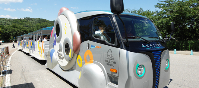 Three wireless electric trams have replaced the old diesel-powered carts used by passengers for transportation within the Seoul Grand Park, an amusement park located south of Seoul.