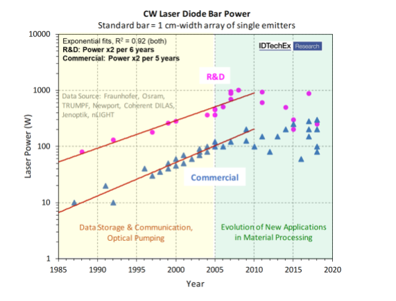 根据 IDTechEx 采集和分析的数据,研究了 1 微米红外波长下激光二极管 bar 条输出功率的发展过程。二极管 bar 条功率的增加促进了直接二极管激光器的发展,并使其在材料加工中的新应用成为可能。二极管激光器技术的持续发展反映在用于精密工程的红外光束质量的提高和用于金属加工的新型可见光激光器的发展。图片来源:IDTechEx