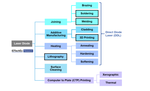 激光二极管市场材料加工细分市场的技术图黑色轮廓表示正在兴起或快速发展的技术直接二极管激光器产生的可见光和红外波长可以加工各种金属、塑料和复合材料。最近的 IDTechEx 报告《激光二极管与直接二极管激光器,2019-2029 年:》对这些材料处理技术与市场进行了分析。图片来源:IDTechEx