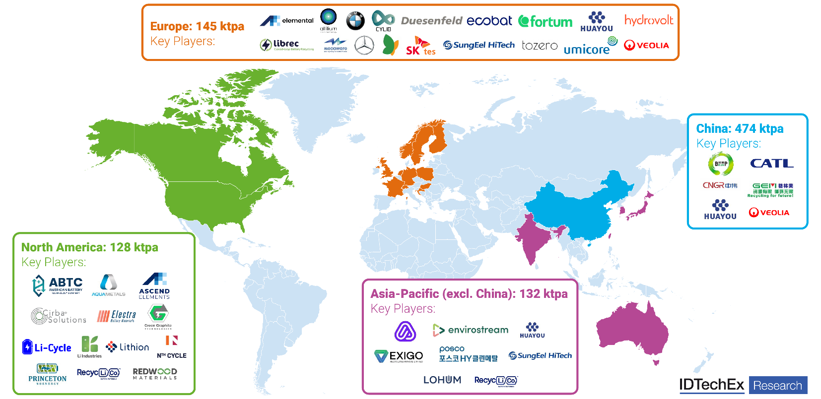 This IDTechEx report details activity by key player and by key region across recycling facilities and expansion roadmaps, funding and investments, partnerships, joint ventures (JV), memorandums of understanding (MOU), mergers and acquisitions (M&A).