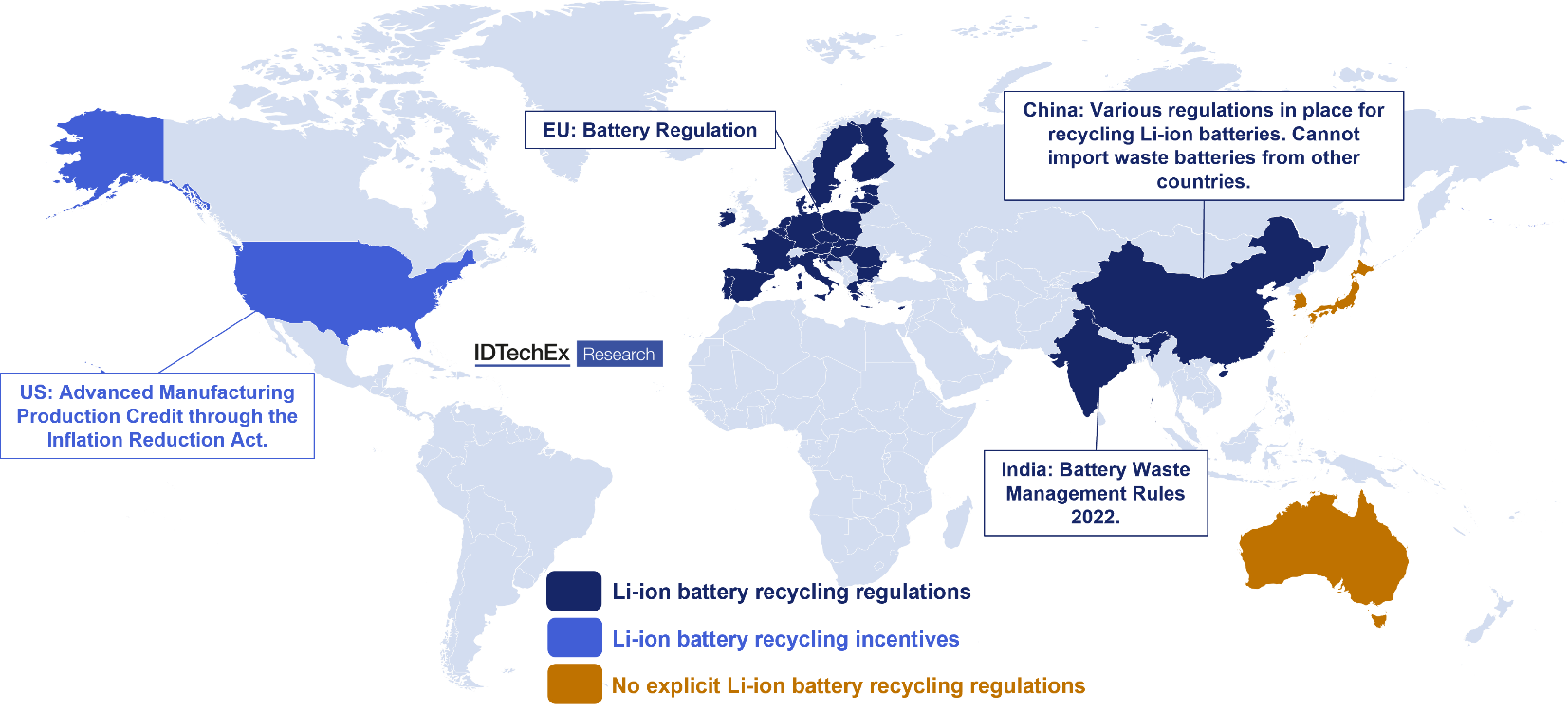 Policies and regulations in key regions will enforce targets for battery collection rates, material recovery efficiencies from recycling, and minimum contents of recycling materials in new batteries. This is particularly the case in the EU, as per the EU Battery Regulation, alongside India with its Waste Management Rules 2022. These targets increase over time, highlighting the importance of first establishing recycling capacity but then the need to expand these capacities and improve the efficiency of the technologies used. This IDTechEx report provides a policy and regulation deep-dive by region and includes analysis into the viability of recyclers and automotive OEMs meeting minimum recycled contents targets, as mandated in the EU Battery Regulation.