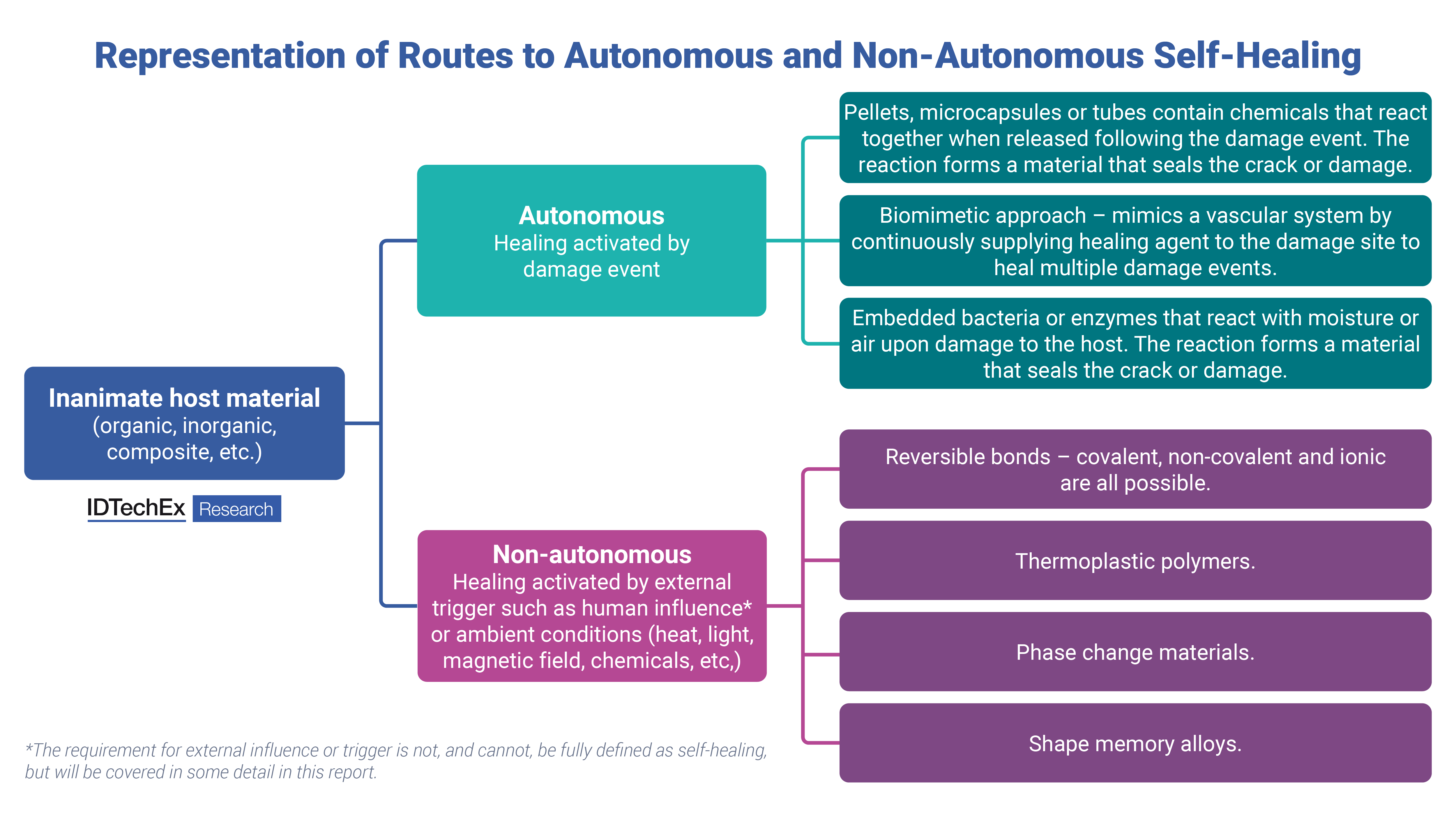 The degree of autonomy with which materials self-heal is of critical importance when discussing this topic. One of the major cost savings associated with self-healing materials is the reduction in losses deriving from maintenance and system downtimes. Autonomous self-healing occurs when the healing is activated directly by the damage event, and various approaches are discussed in the report including microcapsules, vascular systems and embedded bacteria. Non-autonomous healing is activated by an external trigger such as human influence or ambient conditions such as heat, light, or magnetic field. Optimizing non-autonomous healing approaches to activate with readily available, ambient conditions is one of the key hurdles to overcome in the commercialization of self-healing materials. This pain point, and others, are detailed in the market report.